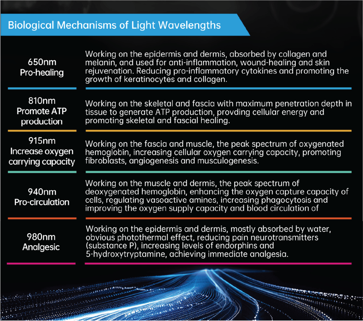Each wavelength interacts with different tissues — from surface-level skin to deep muscles and joints — resulting in more effective treatment and faster outcomes. For example, 650nm targets skin and surface tissue, reducing inflammation and speeding healing. 810-980nm targets deep muscles, tendons, and joints to relieve chronic pain and boost repair.
